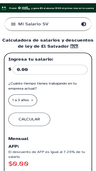 Tu neto mensual y quincenal con desglose de descuentos según ley salvadoreña. Incluye vacaciones, aguinaldo, tramo ISR (sticky), AFP, ISSS, costo empleador, renta anual, comparador mínimo y horas extra (diurna/nocturna/feriado).