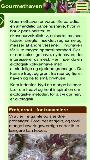 69%gourmethaven er en økologisk køkkenhave med mange almindelige og sjældne grønsager. køkkenhaven er anlagt med højbede, og vi har to små drivhuse. haven er også en frøsamlerhave. på gourmethavens sider finder du hundredvis af artikler og tusindvis af billeder.