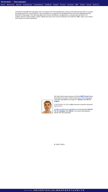 95%david bowie discography covering songs, albums, soundtracks, compilations, promos, bootlegs, videos, cd- and 12" singles, bbc sessions.