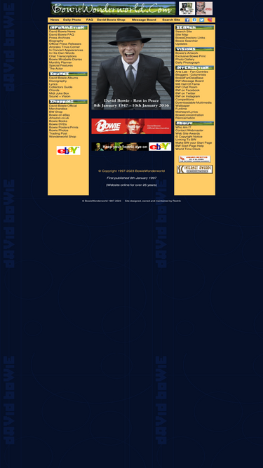 award winning fan site dedicated to david bowie, contains daily news, lyrics, faq, discography, message boards, competitions, photo galleries, information and archives on all aspects of his career