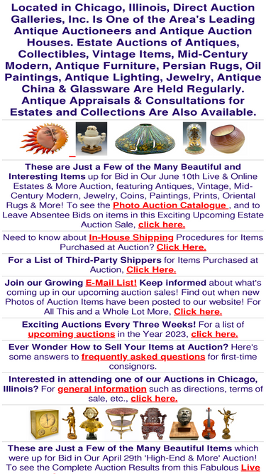 100%chicago, illinois - the area's leading antique auctioneers and antique auction houses. estate auctions of antiques, collectibles, antique jewelry, persian rugs, antique furniture, antique china, oil paintings, retro furniture, etc. antique appraisals available.