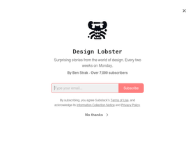 87%surprising stories from the world of design. every two weeks on monday. click to read design lobster, by ben strak, a substack publication with thousands of subscribers.