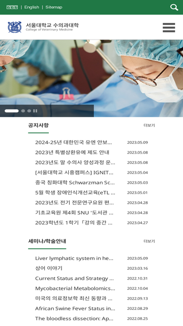 90%학장인사말 “서울대학교 수의과대학은 세계를 선도하는 수의학 교육・연구기관으로 발돋움하고 있습니다.” 안녕하십니까? 서울대학교 수의과대학은 21세기에 들어 괄목할 만한 성장을 이루어 왔습니다. 2019년, 아시아에서 유일하게 미국수의사회 교육위원회(AVMA COE)의 인증을 획득하며 세계적 수준의 교육기관으로 자리매김하였습니다. 신축 동물병원, 생명공학연구동, 평창 산업동물임상교육연수원 및 대동물병원 건립에 이어, 목장시설 구축과 기존 병원의 증·개축을 위한 예산 확보 및 설계가 순조롭게 진행되고 있습니다. 이와 함께 […]