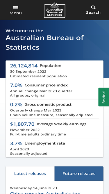82%australia's national statistical agency providing trusted official statistics on a wide range of economic, social, population and environmental matters.