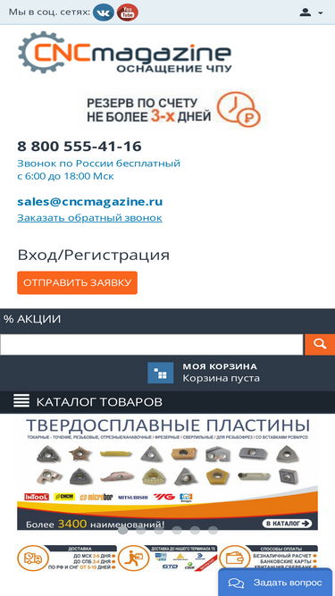 80%металлорежущий инструмент и оснастка для чпу станков − достойный выбор в интернет-магазине cncmagazine! резцы, пластины твердосплавные, фрезы, метчики, сверла, оснастка и многое другое! доставка по рф и снг от 1 суток. 8 800-555-4116, sales@cncmagazine.ru