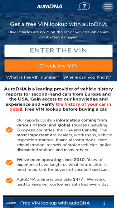 100%VIN number - vehicle identification number. On its basis, autoDNA helps uncovering the history of a car, motorcycle or a trailer.