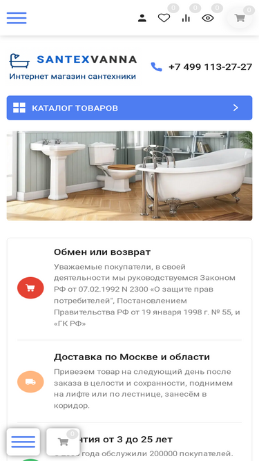 В интернет-магазине «SantexVanna» в наличии более 2000 товаров сантехнических товаров по низким ценам. Доставка сантехники на следующий день, оплата при получении, гарантия до 25 лет.