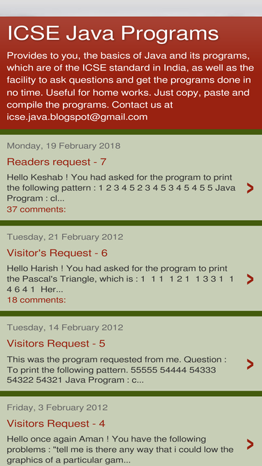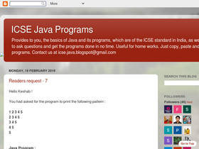 76%provides to you, the basics of java and its programs, which are of the icse standard in india, as well as the facility to ask questions and get the programs done in no time. useful for home works. just copy, paste and compile the programs. contact us at icse.java.blogspot@gmail.com