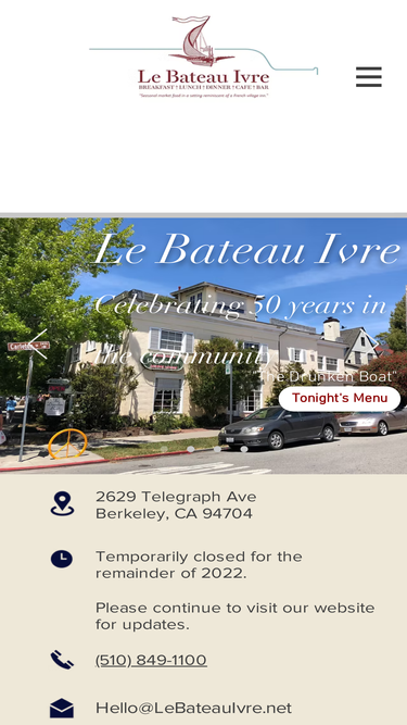 87%Set in a converted home built in 1898, Le Bateau Ivre has been a staple in the Berkeley community since 1972. Our restaurant is currently open for brunch, lunch, and dinner on our outdoor patio and indoors at 25% capacity due to COVID-19. We look forward to seeing you!