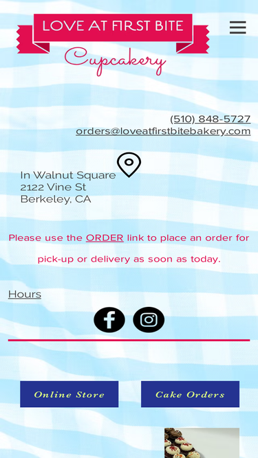 87%Berkeley's longtime favorite for cupcakes and cakes made with love and other fine ingredients offers delivery, gift cards, and in-shop sales. Love at First Bite Bakery is located in the Walnut Square Shopping Center at 2122 Vine Street, Berkeley, California.