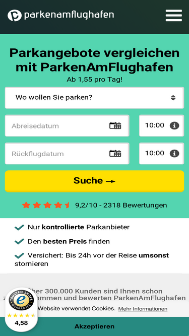Finde deinen besten Parkplatz am Flughafen und spare bis zu 60 % ✈ Gratis Shuttle | Geprüfte Anbieter | Geld-Zurück-Garantie | Keine Stornokosten