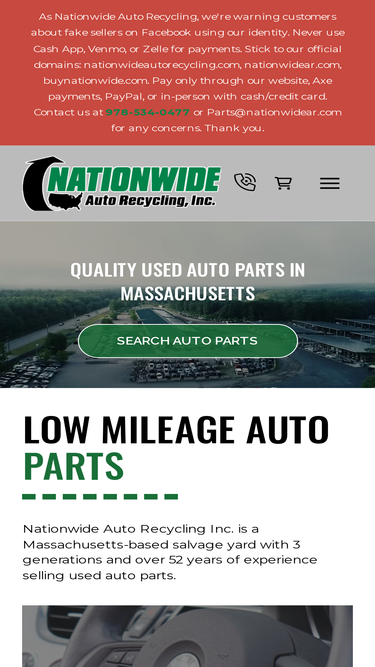 Your cart is currently empty. Return to shop Find Quality used auto parts today! 978-534-0477Contact Nationwide Auto Recycling, Inc.978-534-04771340 Lunenburg RoadLancaster, MA 01523Mon - Fri: 8AM - 5PMNavigation Used Car Parts Finder – Search InventoryBlogWarrantyContactResources Recent ArrivalsSell Your CarHelpful Links ...