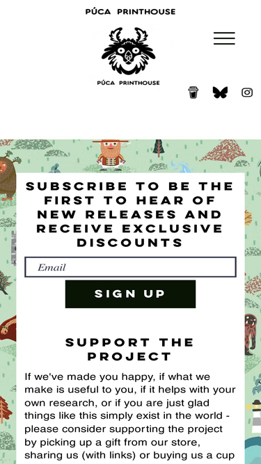 92%At Puca Printhouse we take our time to research the myths, folklore, and to collect social history. We find the locations where myths can be placed, and then create contemporary illustrated maps of our findings.