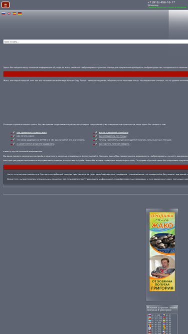 81%здесь вы найдете массу полезной информации об уходе за жако, сможете «забронировать» ручного птенца для покупки или приобрести, выбрав среди тех, которые есть в наличии.