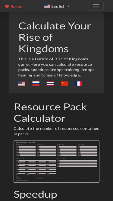 This is fansite of Rise of Kingdoms game. Here you can calculate resource packs, speedups and tomes of knowledge.