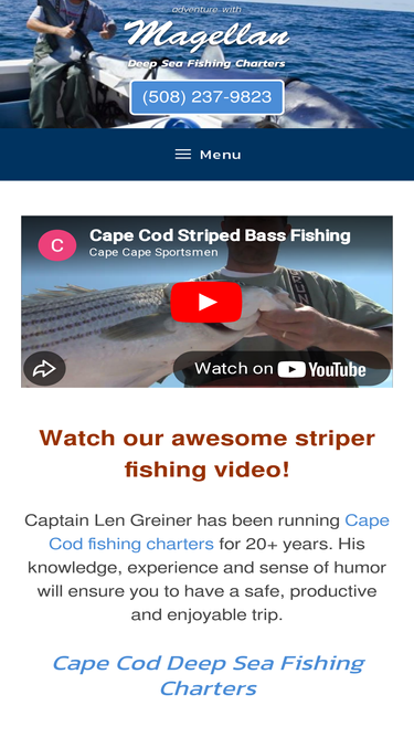 100%Book it and Hook it! - Deep Sea Fishing on Cape Cod - Capt. Len has run fishing charters for Striped Bass, Tuna, Black Sea Bass, Porgies, and Sharks for 20+ years. The Magellan, a 35 ft. Duffy charter boat, built for fishing families and fun!