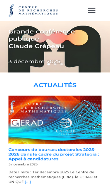 100%Actualités Retrouvez les opportunités de coopération mathématique entre le Canada et la France sur le site : https://canadafrance.pages.math.cnrs.fr/fr Recherche en petits groupes Le CRM et le Centre international de rencontres mathématiques (Cirm) à Marseille offrent la possibilité : de se réunir en équipe afin de