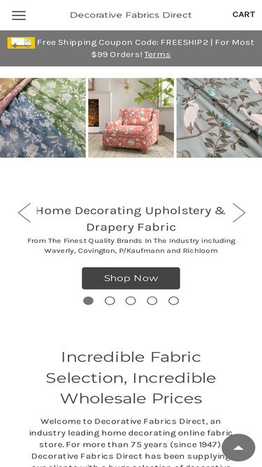 77%decorative fabrics direct is an online fabric store with distributor wholesale pricing on home decorating upholstery fabric, curtain fabric, drapery fabric and faux leather upholstery vinyl. a distributor of fine interior fabric since 1947 with over 20,000 selections from industry leading suppliers including waverly, richloom, covington, premier prints, p/kaufmann, p/k lifestyles, fabricut, naugahyde and sunbrella. all at the same wholesale pricing available in our atlanta showroom! features of our online fabric store https://www.decorativefabricsdirect.com include sample orders, browse capabilities by any combination of color, style or price and a display of stock availability for immediate shipment. payment is by credit card and shipping from our atlanta distribution center is by fedex and usps.