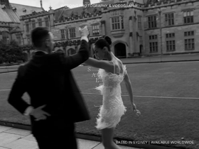 76%Aimee and George were married in October 2022 at the Orthodox Church in Rose Bay. They held their reception at the popular city venue, Events By Alpha, where their wedding stylist, Bianca B Events, transformed the luxury space into a romantic oasis overflowing with pink roses, candles, gold tableware and clear Perspex chairs. What Aimee