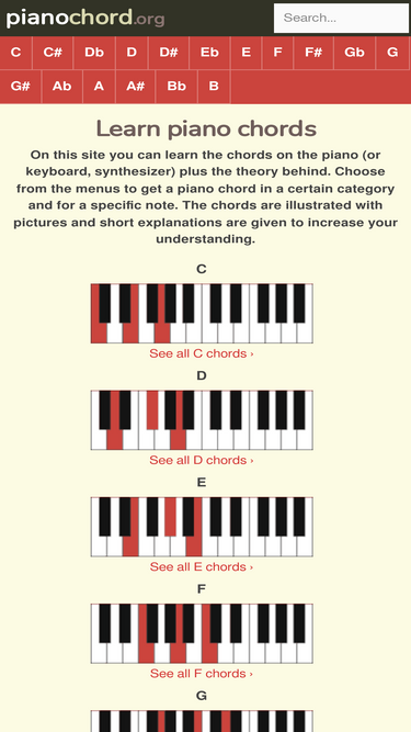 73%learn piano chords - complete overview with pictures of all kinds of piano chords: major, minor, dominant and other categories including notes and fingerings.