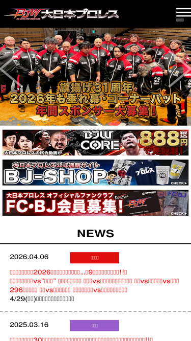 商品説明 発売日 通販:販売中 会場:10/10(金)北海道・恵庭島松体育館大会 商品名 2026年 大日本プロレス壁掛けカレンダー 仕様 B3サイズ・オールカラー・13枚綴り 価格 3,000円(税込) 公式通販サイト「BJ-SHOP」 先行販売特典 毎年大好評の年賀状プレゼント企画を今年も実施!