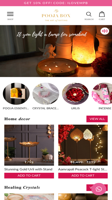 78%Shop beautiful home decor items online, festive gifts for Diwali, Karwa Chauth, Rakhi, Ganesh Chaturthi and weddings. MyPoojaBox is an online puja store offering puja & hawan samagri, healing crystals, salt lamps, eco friendly ganpati idols, diyas, urlis, face rollers, tealight holders and more made in India products.