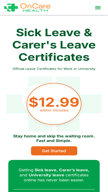 86%OnCare Health provides Medical Certificates for Sick Leave and Carer's Leave for only $12.99 within minutes. Read our Privacy Policy.