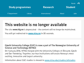 83%høgskolen i gjøvik, ålesund og sør-trøndelag fusjonerte 01.01.2016 med norges teknisk-naturvitenskapelige universitet (ntnu). hig ble etablert i 1994 som følge av den nasjonale omorganiseringen av høgere utdanning. hig besto tidligere av profesjonshøgskolene gjøvik ingeniørhøgskole og sykepleierhøgskolen i oppland, som ble slått sammen til en høgskole.