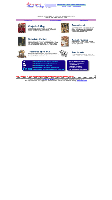all you want to know about turkey. several pictures and topics. all about turkish carpets, turkish cuisine, touristic and historical places. search about turkey is also useful for finding commercial sites, or many useful addresses and information about turkey. this site is updated frequently.