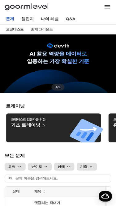 85%구름LEVEL 문제를 풀이하고 부족한 부분을 보완하며 실력을 키워보세요. 구름LEVEL은 코딩테스트에서 가장 높은 비중을 차지하는 알고리즘 문제를 제작하고 풀이할 수 있는 온라인 저지 서비스입니다. 기업에서 선호하는 C, C++, 파이썬(Python), 자바(Java), 자바스크립트(Javascript) 이외에 여러 가지 프로그래밍 언어로 풀이할 수 있습니다.