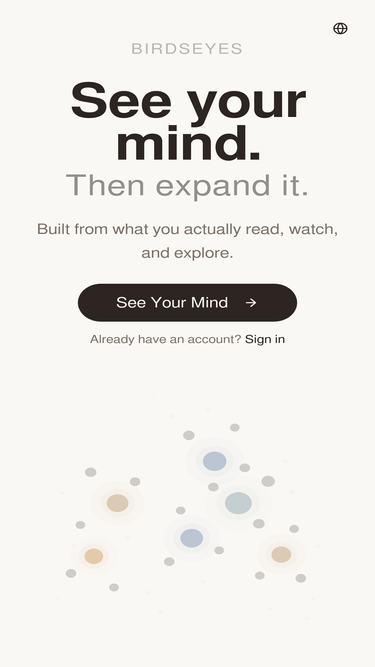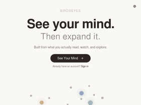 87%Break free from your information bubble. BirdsEyes maps what you consume, then opens windows to ideas you never knew existed.