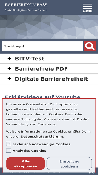 90%ist meine internetseite barrierefrei oder bietet sie hürden und barrieren für behinderte menschen und senioren? barrierefreies webdesign, pdf, dokumente oder formulare für den öffentlichen sektor (egovernment) entsprechen den offiziellen richtlinien der wcag und der bitv. außer dem schnelltest und dem barriere-check bietet anatom5 lösungsansätze um der zielgruppe von menschen mit verschiedenen behinderungsarten das internet zugängig zu machen.
