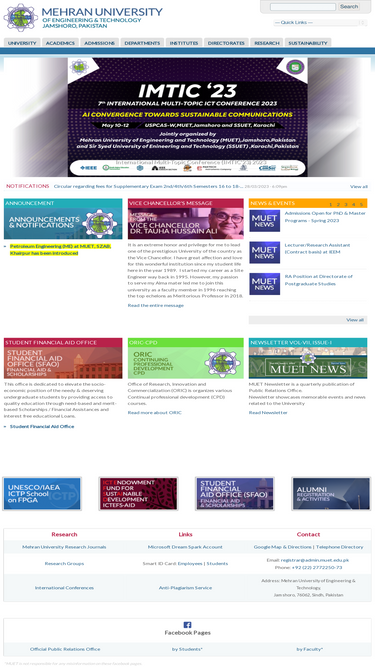 54%official website of mehran university of engineering and technology, jamshoro, pakistan and constituent college of engineering and technology khairpur mirs. provides access to information regarding undergraduate and postgraduate admissions, departments, faculties, people, institutes and directorates. mehran uet is among the top engineering universities in pakistan.