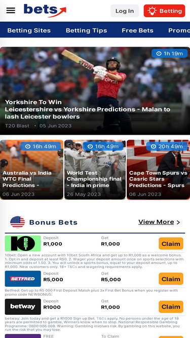 90%South Africa's premium betting site. Bets.co.za brings you the best betting tips, bookmaker bonus codes & free bets for any sport. We offer free live sports streaming & daily sports news.
