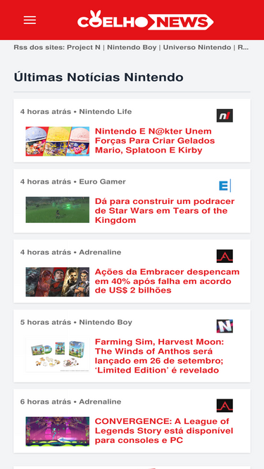 95%Nós trazemos para você as últimas notícias do mundo dos jogos, análises e guias, tudo relacionado à Nintendo Switch, 3DS, eShop e jogos retrô de diversos sites da web. Esqueça o seu leitor de RSS e apenas lembre-se de visitar o CoelhoNews.com para ficar sempre atualizado com o que está acontecendo no mundo dos jogos da Nintendo. Com conteúdo exclusivo e de qualidade, nós estamos sempre buscando manter nossos leitores informados e entretidos com o que há de melhor no mundo dos games. Seja bem-vindo ao CoelhoNews.com!