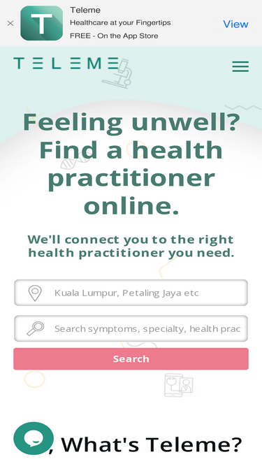 86%TeleMe FAQ - WHAT IS TELEME: It’s an online platform that allows our users to connect to doctors via video consultation. HOW DO I SIGN UP: Just log on to our website at www.teleme.co and click on sign-up.