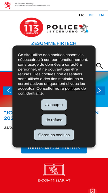62%En cas d'urgenceAppelez le113 Kalender mit bevorstehenden events und Kampagnen 20.11. - 21.11.2025: Teilnahme an der "Moovijob Week" im European Convention Center Luxembourg (ECCL) 24.11.2025: Informationsveranstaltung zum Thema Einbruchsprävention in Hoscheid 08.12.2025: Informationsveranstaltung zum Thema Einbruchsprävention in Düdelingen Sind Sie motiviert...