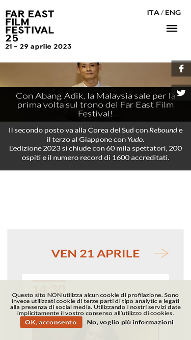 55%Desideriamo informarvi che, ai sensi dell'art. 13 D.Lgs. n.196/2003, la raccolta ed il trattamento di Vostri dati personali da noi effettuata in occasione di attività promozionali o di rapporti commerciali finalizzati alla presentazione di offerte o nella formazione di rapporti contrattuali; sono oggetto, da parte nostra, di trattamenti informatici o manuali come definiti dall'art. 1, comma 2, lettera b) della legge, per finalità di: Adempimenti di legge connessi a norme civilistiche, fiscali, contabili ecc.; in particolare per: Supporto tecnico ed informazioni in merito ai prodotti e servizi da Voi richiesti e/o acquisiti. Verifica della soddisfazione del Cliente; Statistiche. Informazione su future iniziative commerciali, servizi ed offerte, sia da parte nostra che da parte di nostri partner, sia a mezzo posta, fax o internet. I trattamenti sono svolti dal titolare con modalità cartacee, informatiche, telematiche sui sistemi informatici e server nella propria disponibilità, dal personale (interno ed esterno) incaricato, tra cui il personale di www.fareastfilm.com, che tratta i dati al fine di gestire nel modo migliore il sito con modalità informatiche e telematiche. www.fareastfilm.com raccoglie i dati relativi agli accessi ed alla navigazione all'interno dei siti per permettere il funzionamento dei servizi e delle sezioni che richiedono l'identificazione dell'utente e utilizza le informazioni raccolte per l'amministrazione tecnica del sito e per eventuali analisi statistiche circa l'utilizzo del sito stesso. www.fareastfilm.com utilizza dati statistici globali sul tipo di traffico ed altre informazioni correlate al sito, senza diffondere o comunicare a terzi dati relativi alla singola utenza. Viene esclusa ogni forma di diffusione o comunicazione a terzi (salvo prestatori di servizi incaricati, nell'ambito delle finalità dichiarate).