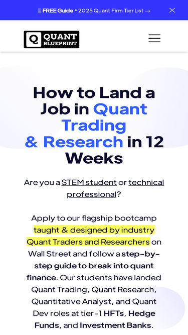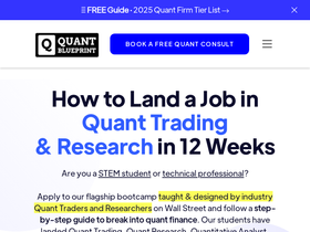 76%Taught by industry quants, this bootcamp teaches from ground up everything needed to break into quant finance jobs, within 12 weeks. 500+ actual interview questions from top HFT firms and Hedge Funds (Jane Street, Two Sigma, Citadel, etc.). 80+ videos teaching probability, statistics, betting, strategy, brain-teasers, and more.