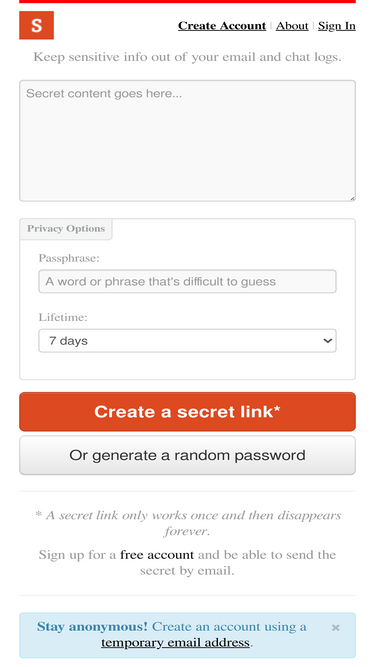 82%create secure one time self destructing notes to send sensitive information with simple short urls.