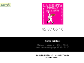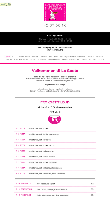 84%velkommen til la sosta pizza og bøfhus. du finder hele vores menukort i menuen ovenover. når du har fundet det du ønsker kan du afgive din bestilling pr. telefon, hvorefter maden er klar til afhentning hos os. vi glæder os til at se dig! vi modtager dankort og check i butikken. dankort modtages ved udbringning efter aftale ved bestilling.