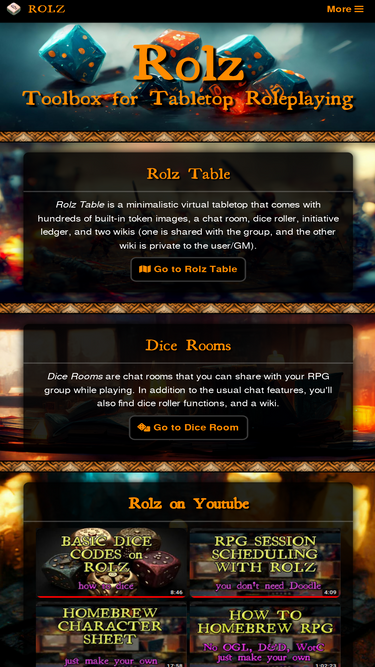 68%Rolz is a free online dice roller and minimal virtual tabletop (VTT). Create dice rooms, roll d20s with advanced formulas, track initiative, and take notes with shared and private wikis.