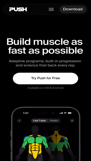 74%PUSH was built with a single goal — to build muscle as fast and efficiently as possible. Powered by and avanced progression algorithm and grounded in the latest scientific research, every workout adapts to your performance in real time.