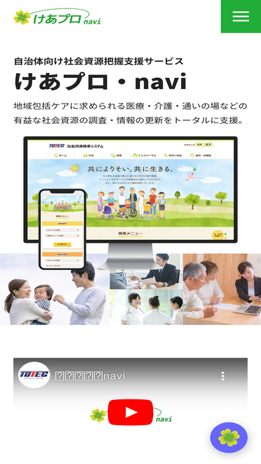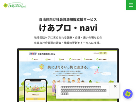 64%自治体向け社会資源把握支援サービスけあプロ・navi。「検索システム」による資源活用、「情報センター」の調査・情報更新サポートを組み合わせたクラウドサービスを提供します