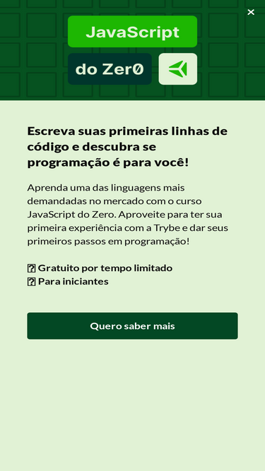 94%O JavaScript do Zero faz parte dos cursos de programação da Trybe. Aprenda a programar com uma das linguagens mais usadas no mundo, o JavaScript. Escreva suas primeiras linhas de código e descubra se a programação é a área certa para você.
