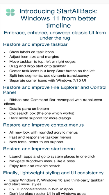 58%startallback restores taskbar, start menu, context menus, explorer, sanity, style and order!