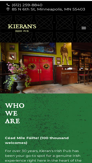 100%Kieran’s Irish Pub has been your go-to spot for a genuine Irish experience right here in the heart of the Twin Cities. From energetic nights filled with live local music and expertly poured pints (proper pours, to be exact) to cozy snugs perfect for savoring our renowned fish & chips, we pride ourselves on offering a warm welcome and engaging conversation. Whether you’re joining us for a special occasion or a casual visit, we’re here to make every moment memorable.