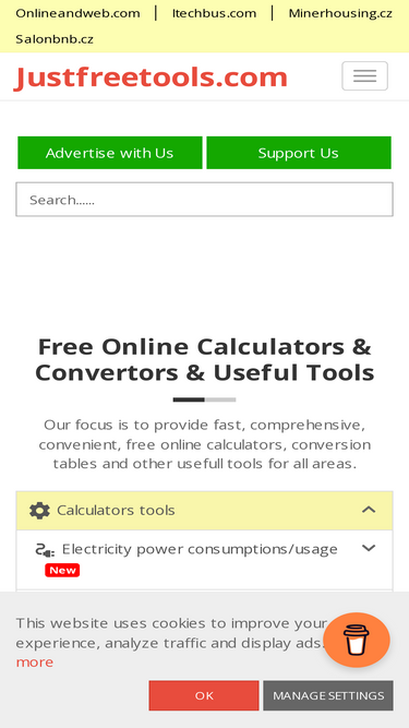 95%free online calculators. ✅ transfer tools, unit conversions and other usefull functions and software. ✅ 1 000 000+ users visit justfreetools.com every month. ✅ calculators, conversion, web design, electricity & electronics, mathematics, online tools, text tools, pdf tools, code, ecology. ✅