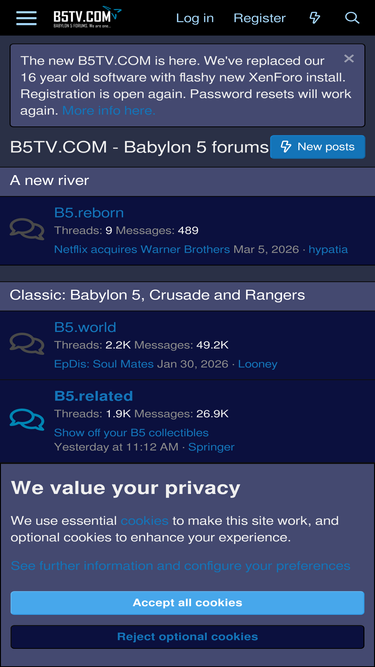 68%Babylon 5 forums and fan community. Chat about the original Babylon 5, Crusade or the upcoming B5 reboot.