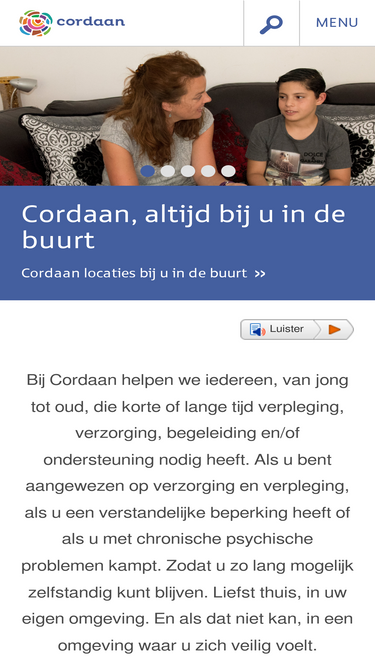 94%Als je zorg of hulp nodig hebt, voor even of voor langere tijd, kun je terecht bij Cordaan. Wij zijn actief in Amsterdam, Diemen, Huizen en Nieuw-Vennep.